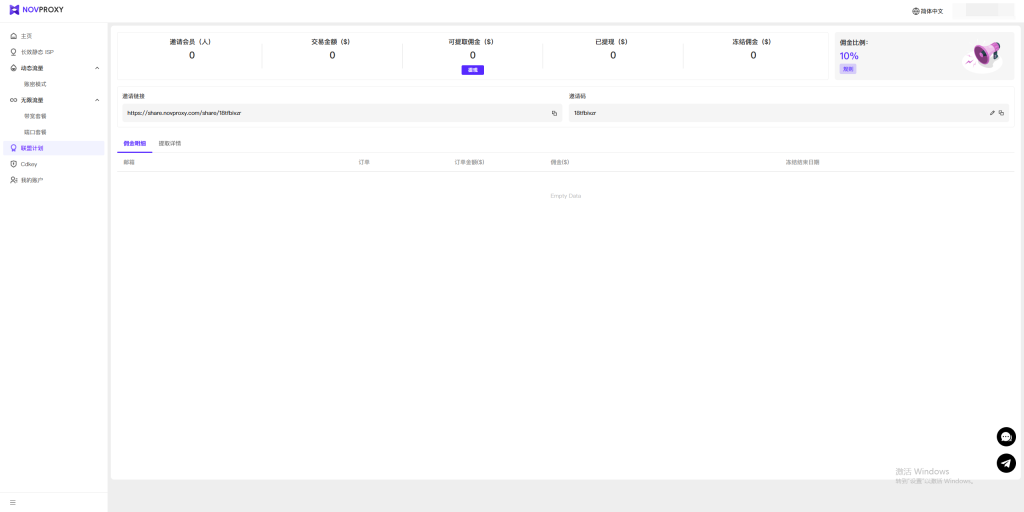 在联盟计划里您可以尝试获取您的晋升佣金了。访问 NovProxy 的官方网站,获取您的推广链接。您可以在任何通过您的链接完成支付的用户的个人页面上查看所有您的邀请数据。您还可以提取您的佣金,并通过任何支持的提供商进行转账。对于所有已支付的活动,您都能获得 10% 的佣金。这是一个固定的比率,不会改变。